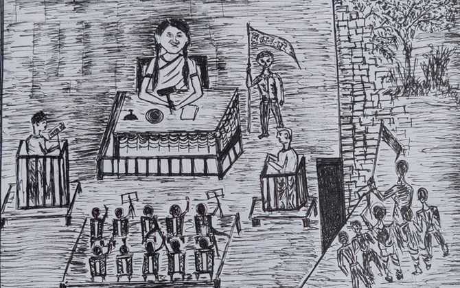 সঞ্জয় দেবলস্করের রেখাচিত্রে কলেজ ছাত্রী গোপা দত্তের এজলাস। পরবর্তীকালে গোপা আইচ নামে সত্যজিৎ পরিচালিত ‘ঘরে বাইরে’ চলচ্চিত্রেও অভিনয় করেছিলেন তিনি