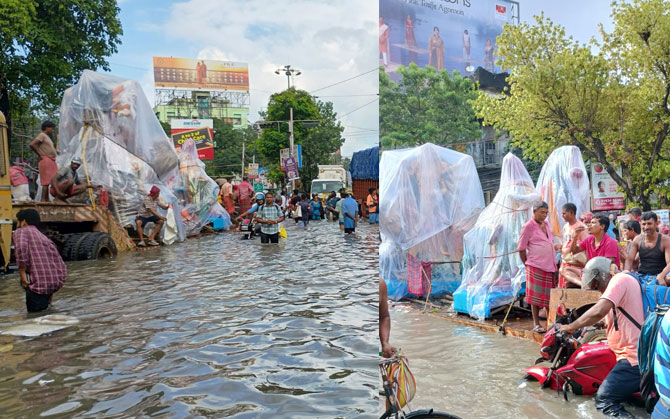 নাগাড়ে বৃষ্টিতে উত্তর থেকে দক্ষিণ, জলমগ্ন গোটা শহর। বহু রাস্তা, যেগুলিতে আগে জল জমেনি, সেগুলিও ডুবে গিয়েছে হাঁটু সমান জলে। গঙ্গায় ফের জোয়ার এলে পরিস্থিতি আরও জটিল হবে বলে আশঙ্কা প্রশাসনের।